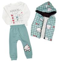 Костюм тройка, утепленный, для мальчика.Стеганый жилет из болоньи, который хорошо согревает за счет трикотажного подклада и синтепона в составе. Декорирован принтом «крупная клетка». Капюшон внутри отделан трикотажной тканью. Застежка молния по центру, по всей длине.