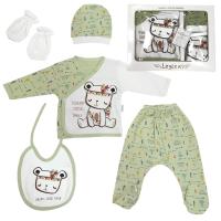 Комплект для новорожденного мальчика из 5 предметов.Кофточка с запахом, с застежкой на кнопки снаружи с правой стороны, изнутри с левой стороны. Декор на полочке: яркий принт "Медвежонок-индеец" с объемными деталями. Горловина, планка с застежкой, низ изделия и рукавов отделаны трикотажным кантом. Длинный рукав. Внутренние швы.
