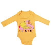 Боди с длинным втачным рукавом, выполнено из хлопкового трикотажа - интерлок. Передняя половинка декорирована очаровательным принтом "Cпящий утёночек". Вырез горловины круглый, обработан бейкой из основного полотна в тон. Модель на плечиках с запахом на кнопках и кнопки-застежки в паховой зоне снизу, между пройм. Внутренние швы.Размер 62 Длина- 35 см, обхват груди- 40 см, длина рукава- 19 см.