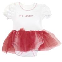 Нарядное боди с юбкой для настоящей маленькой принцессы, из эластичного х/б трикотажа (интерлок). В трёх расцветках: белый/бордовый, белый/голубой и молочный.Боди в бело-бордовом цвете. Данная модель представлена двухслойной юбочкой из мягкого фатина. Полочка украшена надписью из страз "Моя малышка". Горловина, проймы обмётаны зигзагообразной строчкой в цвет юбки и отделаны трикотажным кантом. Горловина круглая в цвет верха изделия, присутствует декоративная отделка края. На правом плечике застежка на 2 пробивные кнопки. Юбка с круговой сборкой по талии. Застежка кнопки снизу, между пройм. Рукав короткий, край рукава на тонкой резинке со сборкой. Вес изделия 0,69 кг.