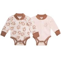 Боди из х/б трикотажа с принтом "Обезьянки и банан". Длинный рукав. Горловина, рукав на трикотажном манжете, проймы отделаны трикотажным кантом. Застёжка кнопки по центру, по всей длине и снизу, между пройм. Рукав-реглан у размера 56. Наружные швы у размеров 56,62.Размер 56: длина 30 см, обхват груди 38 см, длина рукава 19 см.