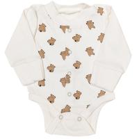 Боди из х/б трикотажа интерлок. Передняя сторона декорирована принтом. Длинный втачной рукав. Горловина на манжете из основного полотна. Проймы отделаны трикотажным кантом. Застёжка кнопки по центру, по всей длине и снизу, между пройм. У размера 56 варежка антицарапка. У размеров 68, 74, 80 внутренние швы.Размер 56: длина - 31 см, обхват груди - 41 см, длина рукава - 18 см.