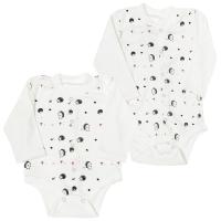 Боди из х/б трикотажа с принтом. Длинный втачной рукав, низ обработан швом вподгибку двойной строчкой. Горловина на манжете из основного полотна. Проймы отделаны трикотажным кантом. Застёжка кнопки по центру, по всей длине и снизу, между пройм.Размер 62: длина - 36 см, обхват груди - 47 см, длина рукава - 20 см.
