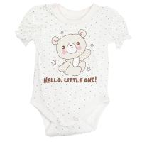 Боди из х/б трикотажа (интерлок). Полочка украшена термопечатью "Мишка". Горловина круглая, присутствует декортативная отделка края. На правом плечике застежка на 2 пробивные кнопки, розового цвета. Застежка кнопки снизу, между пройм. Горловина, проймы отделаны трикотажным кантом в цвет изделия. Короткий рукав, низ рукава со сборкой.Размер 62: длина 35 см, обхват груди 40 см.