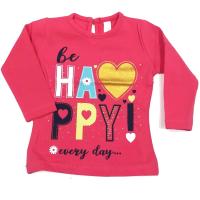 Джемпер для девочки, из эластичного, х/б трикотажа, с крупной надписью "будь счастлив каждый день", украшенной блестящим сердечком и стразами. Полуприлегающий силуэт. Длинный рукав. Горловина отделана трикотажным кантом. Застежка пуговица на спинке.Размер 68: длина 30 см, обхват груди 46 см, длина рукава 23 см.