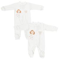 Комбинезон свободного кроя из х/б трикотажа с принтом. Вырез горловины круглый, форма выреза на манжете из основного полотна. Застежка кнопки по центру, по всей длине и по штанишкам. Закрытые носочки (размер 74, 80 с открытыми ножками на манжете). Рукав длинный втачной на трикотажном манжете из основного полотна. Размер 56 с варежкой антицарапкой. У размеров 56, 62 наружные швы.Размер 56: длина - 46 см, обхват груди - 48 см, длина рукава - 18 см.