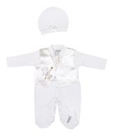 Нарядные комбинезон и шапочка для мальчика. Комбинезон с имитацией жилета. Жилет из атласной ткани, с застежкой на перламутровую пуговицу-кнопку. На полочке аппликация-вышивка. Горловина комбинезона на манжете. На горловине атласный галстук. Застежка комбинезона на кнопки по центру, по всей длине. Закрытые ножки. Шапочка-колпачок на манжете. Украшена атласным бантиком.Размер 62 Кофточка: длина 47 см, обхват груди 50 см, длина рукава 20 см. Шапочка: обхват головы 36-40 см.
