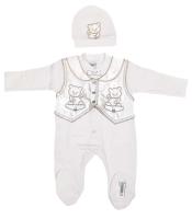 Комбинезон с жилеткой. Жилет пришивной на кнопочках, украшен вышивкой. Комбинезон спереди на кнопочках. К воротничку пришита "бабочка". В комплекте шапочка.Рост 62, длина- 44 см, обхват груди- 50 см, длина рукава- 19 см, длина (внутр. шов ножки)- 15 см.