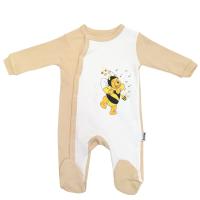 Комбинезон свободного кроя. Полочка украшена ярким принтом-термопечатью "Винни Пух-пчелка". Горловина и планка обработаны трикотажным кантом. Застёжка кнопки по правой стороне, по всей длине. Рукава на манжете из основного полотна в цвет изделия. Штанишки с ластовицей. Модель с закрытыми носочками.Размер 62: длина- 48 см, обхват груди- 48 см, длина рукава- 19 см.