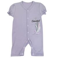 Песочник из однотонного х/б трикотажа (интерлок). Полочка украшена ярким принтом "Пёрышко" с добавлением глиттера. Горловина, планка с застежкой, штанишки отделаны трикотажным кантом. Застежка кнопки по центру, по всей длине и по штанишкам. Короткий рукав, край рукава на тонкой резинке со сборкой.Размер 62: длина 44 см, обхват груди 50 см.