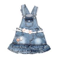 Сарафан из джинсы, с декоративными потертостями и принтом-вышивкой "цветы", из ткани, украшенной стразами. Отрезной по талии, на спинке присобран на резинке, с регулируемыми бретелями. На груди накладной карман с клапаном, украшенным бусинами и кристаллом. На поясе шлевки, ремешок с застежкой, украшенный цветами из ткани и бусин. По бокам на поясе застежки пуговицы. Два боковых прорезных кармана. Имитация ширинки. Сзади один накладной карман, украшенный вышивкой. По низу юбочки двойная рюшка.Размер 86: длина 44 см, обхват талии 46 см.
