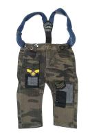 Штанишки для мальчика на подяжках камуфляжной расцветки. 4 кармана, шлёвки. Застёгиваются на молнию и пуговицу. Декорированы нашивными заплатками. Стильно и модно !Рост 74 см, длина- 37 см, обхват талии- 51 см.