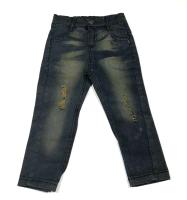 Джинсы для мальчика с декоративными сквозными потертостями. На пояске шлёвки для ремешка. Застёжка-гульфик молния и пуговица на поясе. С внутренней стороны пояска вставлена резинка и пуговицы для её регулирования. Два прорезных кармана спереди. два накладных кармана сзади. Джинсы с декоративными непркрасами. Заженные к низу.Размер 74: длина- 41 см, обхват талии- 46 см.