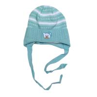 Шапочка детская, вязаная из хлопка и акрила, с цветными полосками, на подкладе из эластичного, х/б трикотажа. Снизу с отворотом, полукруглыми ушками и завязками. Украшена принтом-вышивкой "мишутка" со стразами.