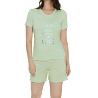 Женский комплект, состоящий из футболки и шорт. Выполнен из трикотажного вискозного полотна с добавлением эластана. Пижама имеет свободный крой, что дает свободу движений. Материал для сна и отдыха: мягкий, легкий, эластичный идеально подойдет как для дома так и для сна.Футболка прямого кроя. Передняя половинка декорирована блестящей надписью на английском языке "всё, что тебе нужно - это любовь". Горловина V-образной формы окантована основным полотном в тон. Горловина спинки внутри обработана настрочной бейкой контрастного цвета. Рукав короткий втачной. Низ изделия и рукавов обработан швом вподгибку двойной строчкой.