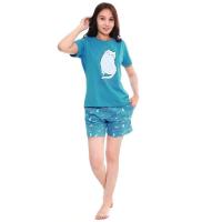 Пижама женская, состоящая из футболки и шорт. Изготовлена из эластичного х/б трикотажа (кулирное полотно). Полочка по центру украшена надписью "Mяу" и термопечатью "Кошечка".Футболка прямого кроя. Горловина круглая, отделана трикотажным кантом, в цвет изделия. Горловина спинки внутри обработана настрочной планкой из кулирки. Рукав короткий, втачной. Низ изделия и рукавов обработан швом вподгибку двойной строчкой.