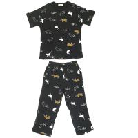 Пижама женская, состоящая из футболки и бридж. Изготовлена из эластичного х/б трикотажа (кулирное полотно). Украшена надписями и принтом "Кошки".Футболка прямого кроя. Горловина круглая, на тонком трикотажном манжете, в цвет изделия. Горловина спинки внутри обработана настрочной планкой из кулирки. Рукав короткий, втачной. Низ изделия и рукавов обработан швом вподгибку двойной строчкой.