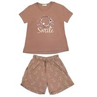 Пижама женская, состоящая из футболки и шорт. Изготовлена из эластичного х/б трикотажа (кулирное полотно). Полочка украшена надписью "Smile" и принтом "Медведь".Футболка прямого кроя. Горловина круглая, на тонком трикотажном манжете, в цвет изделия. Горловина спинки внутри обработана настрочной планкой из кулирки. Рукав короткий, втачной. Низ изделия и рукавов обработан швом вподгибку двойной строчкой.
