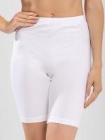 Панталоны удлиненные женские выполнены из однотонного эластичного трикотажного полотна (кулирка). Модель с высокой линией талии. Препятствуют трению внутренней части бедра. В поясе на закрытой резинке. Двойная ластовица проходит вдоль всей внутренней поверхности ног. Передняя часть изделия бесшовная, сзади имеется центральный шов. Отсутствуют боковые швы. В проймах обработаны швом вподгибку.Размер 4: длина - 51,5 см, обхват талии - 63-83 см, обхват бедер - 86-100 см.