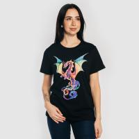 Футболка женская удлиненная с втачным коротким рукавом. Прямого силуэта. На полочке яркий принт-термопечать "Дракон". Горловина круглая, обработана воротником из рибаны в цвет изделия. Горловина спинки внутри обработана настрочной планкой из кулирки. Низ изделия и рукавов обработан швом вподгибку двойной строчкой. Модель выполнена из кулирки, рассчитана на рост 164-173 см.Размер 44: длина 63 см, обхват груди 94 см.