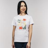 Футболка женская с втачным коротким рукавом. Выполнена из хлопкового трикотажа кулирное полотно. Прямого силуэта. На полочке цветочный принт c надписью на английском языке "простота - самое лучшее". Круглый вырез горловины с трикотажной резинкой нежно обрамляет шею. Горловина спинки внутри обработана настрочной планкой из кулирки. Низ изделия и рукавов обработан швом вподгибку двойной строчкой.Размер 44: длина 63 см, обхват груди 92 см.