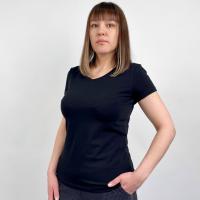 Футболка женская, однотонная, из эластичного, х/б трикотажа. Полуприлегающий силуэт. Короткий рукав. V-образный вырез. Горловина на трикотажном манжете, с внутренней отделкой шва на спинке трикотажным кантом.Размер 42 (рост 170): длина 59 см, обхват груди 82 см.