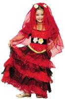 Карнавальный костюм для девочки из 3 предметов: платье, головной убор, пояс.Платье из иск.атласа, удлиненное. Отрезное по талии. На груди полукруглая вставка из золотистой ткани-сетка, украшенной блестящей декоративной тесьмой и кружевом. Полочка украшена пайетками. Рукав из иск. атласа и многоярусного фатина. Застежка молния на спинке. По линии талии баска полукруглой формы, отделанная пайетками и золотистой, декоративной тесьмой. Верхняя многослойная юбка из фатина, отделанного яркой строчкой по краю.