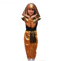 Карнавальный костюм для девочки из 4 предметов: топ, юбка, головной убор, напульсники- 2 шт.Топ укороченный, из трикотажа черного цвета, снизу на резинке. Большой, полукруглый воротник из золотистой иск.парчи и трикотажа, с завязками у горловины.