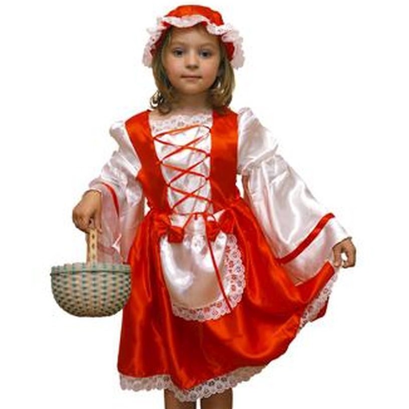 Карнавальный костюм Красная шапочка для девочки, из 3 предметов: платье, шапочка, фартук.Платье отрезное по талии, с корсетной шнуровкой из атласной ленты на полочке. Вырез отделан кружевом. Рукав со сборкой у плеча, присобран на резинке, формирующей фонарик, снизу раклешенный, украшенный полоской из атласной ленты. Застежка молния на спинке. Юбочка по талии присобрана на резинке. Низ юбки украшен кружевом.