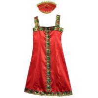 Карнавальный костюм для девочки из 2 предметов: сарафан и кокошник.Сарафан из красного иск. атласа. Удлиненный, приталенный силуэт, к низу расклешенный, на лямках. Застежка молния на спинке. Отделан широкой, декоративной тесьмой с ткаными рисунками.
