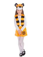 Карнавальный костюм "Тигра" для девочки из 3 предметов: юбочка, жилетка, маска-шапочка.Юбочка прямого кроя, из плюша, на закрытой резинке в поясе, без рисунка. Сзади длинный, полосатый хвостик из плюша.