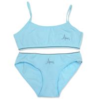 Комплект белья для девочки однотонный: топ+трусики. Топ на тонких бретельках из эластичного х/б трикотажа, с открытой резинкой под грудью. Вырез, бретели, проймы отделаны эластичным трикотажным кантом. На груди надпись. Трусики для девочки, из эластичного х/б трикотажа с надписью. В поясе и в проймах отделаны эластичным, трикотажным кантом.Размер 12-13 Топ: длина- 23 см, обхват груди- 64 см, обхват под грудью- 56-58 см.
