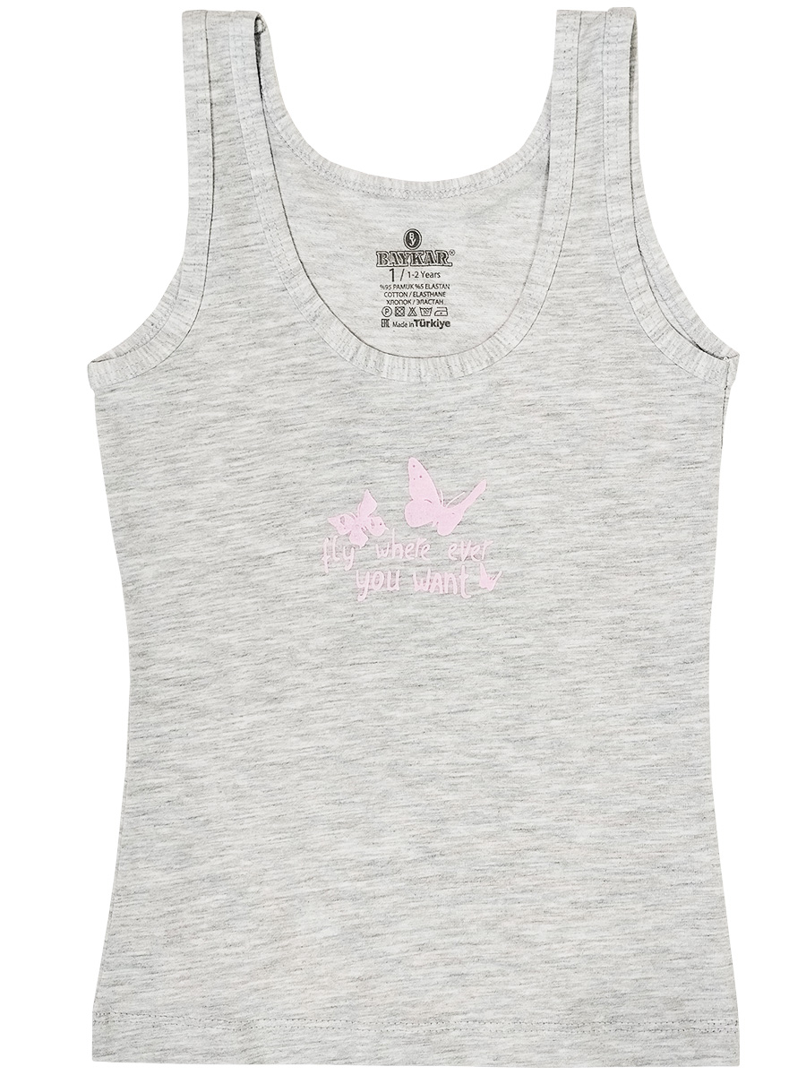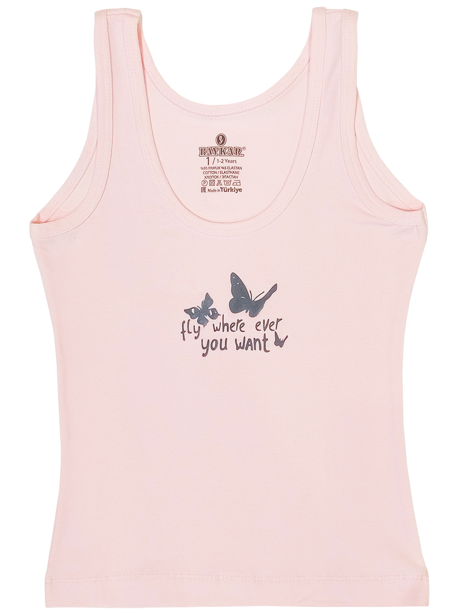 Маечка для девочки, из эластичного х/б трикотажа с различными принтами: из трикотажа в полоску/ из однотонного трикотажа с принтом "бабочки". Полуприлегающий силуэт. Широкие бретели отделаны эластичным трикотажным кантом.ВНИМАНИЕ! Расцветка может прийти любая, из представленных на фото.