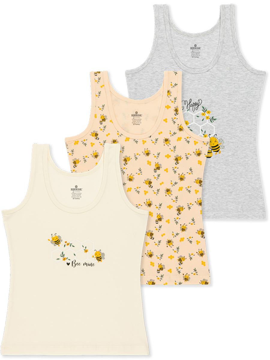 Майка для девочки на широких бретелях с принтом "Пчелки". Выполнена из эластичного х/б трикотажа кулирное полотно. Отделка выреза и пройм из эластичного трикотажного канта из основного полотна. Низ изделия подвернут и прошит двойной строчкой.Размер 1 (98-104): длина - 41 см, обхват груди - 53 см.