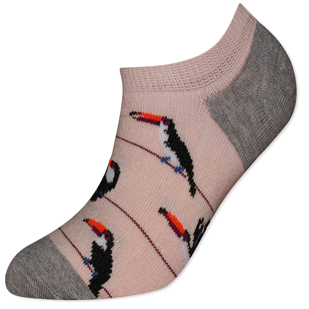 Ультраукороченные носки для девочек. Украшены тканым принтом "Туканы и лебеди" по всей длине изделия. Контрастные пятка и носок.