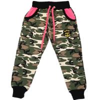 Штаны для девочек в стиле милитари. Пояс и низ на трикотажной манжете. Пояс с внутренней резинке со шнурком. Два боковых кармана, вход в карман обработан трикотажной манжетой. Левая штаниа украшена нашивкой армия. Боковая часть кармана и шнуток выполнены из материала контрастного цвета.