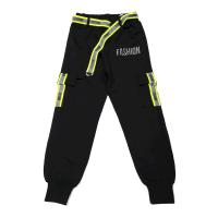 Штаны для девочки. Штаны прямого кроя, на манжетах, на закрытой резинке в поясе. Поясок со шлевками и ремешком из яркой смесовой тесьмы с надписями. Два боковых накладных кармана с клапанами, и отделкой яркой смесовой тесьмой с надписями. На одной штанине светоотражающая надпись.Размер 140: длина 81 см, обхват талии 54-60 см.