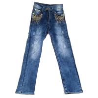 Классические джинсы для девочки. На поясе шлевки для ремня, пять карманов. Джины украшены декоративными потертостями и термостразами. Застежка-гульфик на молнии и пуговица на поясе.Рост 146: Длина - 80см, обхват талии - 58см