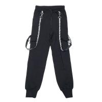 Штаны для девочки, из эластичного х/б трикотажа, внизу на широких манжетах, в поясе на манжете с резинкой и шнурком. Два боковых прорезных кармана. По бокам штанин два накладных кармана с клапанами. Тесьма с надписями крепится к поясу и к карманам карабинами, что позволяет применить ее, в двух вариантах: подтяжки или декоративный элемент.Размер 140: длина 91 см, обхват талии 64-70 см.