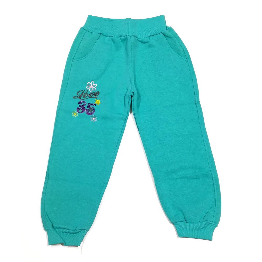 Штаны утепленные для девочки, из футера с начесом. Снизу на трикотажных манжетах, в поясе на манжете с резинкой. Два боковых  прорезных кармана. Украшены красочной вышивкой-принтом.