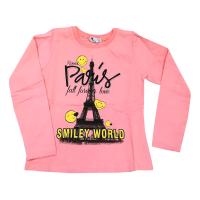 Джемпер для девочки. Полуприталенного силуэта из эластичного хб трикотажа. Горловина обработана трикотажной манжетой. Джемпер украшен ярким принтом "Париж и смайлики", надпись украшена стразами.