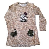 Туника для девочки, утепленная, из эластичного х/б трикотажа, с начесом с лицевой стороны. На полочке принт "письмо"из ткани и пайеток и два накладных кармана, вышитых пайетками. Полуприлегающий силуэт. Горловина на манжете. Спинка с полукруглым низом.Размер 140: длина 68 см, обхват груди 74 см, длина рукава 51 см.