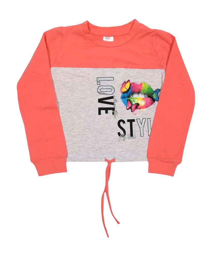 Укороченный джемпер для девочки, из трикотажа, с красочным принтом. Прямой крой. Горловина, рукав на манжетах.По низу кулиска с завязками.