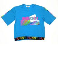 Футболка для девочки. Прямой крой. Спереди по низу изделия пришивная широкая резинка. В области горловины декоративные вырезы. На рукавах и полочке принт.Рост 140 см, длина- 51 см, обхват груди- 88 см.