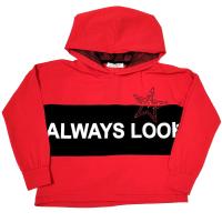Укороченный джемпер для девочки из х/б трикотажа (кулирное полотно). Модель прямого кроя. Горловина круглая с капюшоном. Капюшон состоит из 2-х частей половин, с сетчатым подкладом черного цвета. Горловина спинки внутри укреплена настрочной планкой из кулирки черного цвета. Рукав длинный с заниженной проймой. Полочка со вставкой ткани контрастного цвета из основного материала. Декорирована надписью "Always look" и принтом из страз "Звезда". Низ рукавов на манжете из основного полотна. Низ изделия обработан швом вподгибку двойной строчкой. Спинка с центральным швом сзади по всей длине изделия.Размер 122: длина 41 см, обхват груди 78 см, длина рукава 32 см.