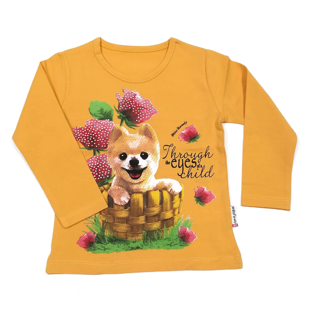 Джемпер для девочки, из эластичного, х/б трикотажа, с красочным принтом "щенок", украшенным стразами. Полуприлегающий силуэт. Горловина отделана трикотажным кантом.Размер 92: длина 36 см, обхват груди 52 см, длина рукава 29 см.