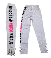 Лосины утепленные для девочки. В поясе на закрытой резинке. Внизу штанин полукруглые вырезы со шнуровкой. На одной штанине яркая надпись-трансфер.Размер 134: длина 68 см, обхват талии 44-50 см.