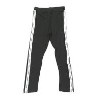 Лосины черного цвета, из эластичного х/б трикотажа. В поясе на закрытой резинке. По бокам лампасы из смесовой ленты с блестящими полосками и надписями.