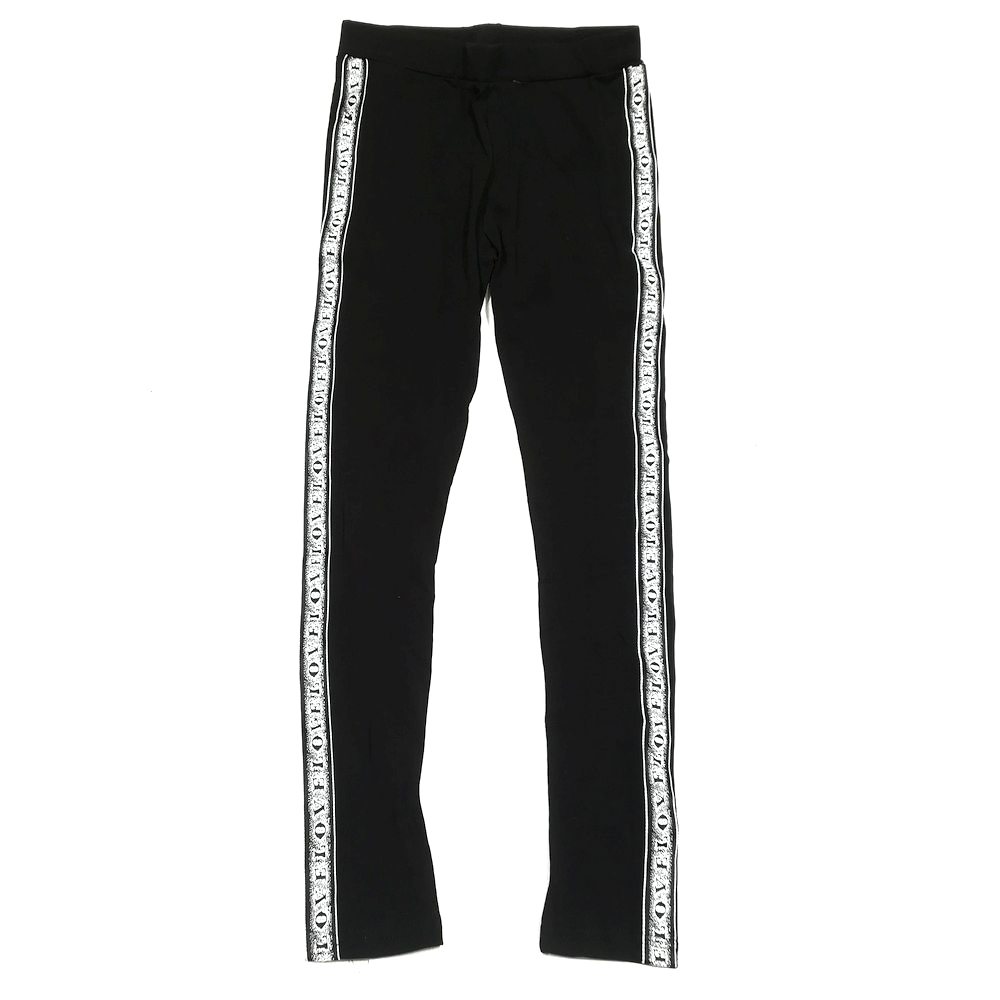 Лосины для девочки, из эластичного, х/б трикотажа. В поясе на закрытой резинке. По бокам лампасы из декоративной тесьмы с надписями.