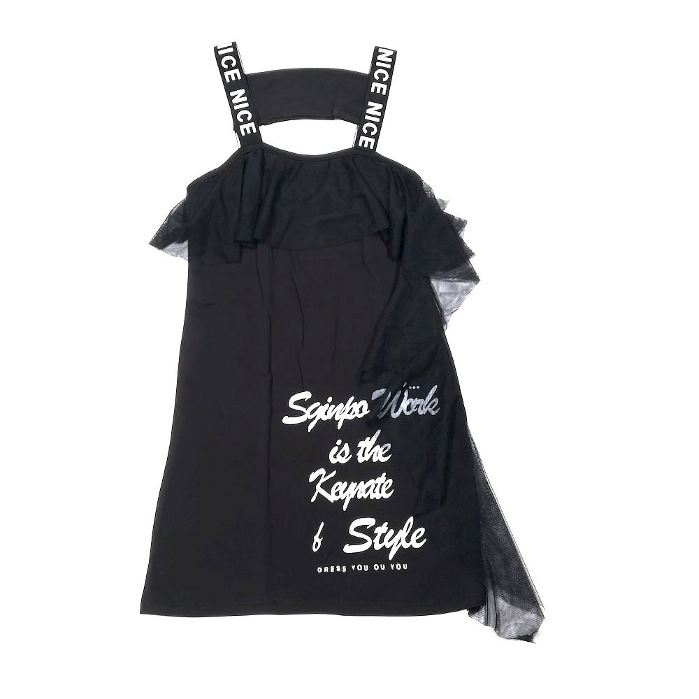 Платье из эластичного трикотажа. Расклешенный силуэт. Волан из фатина по вырезу и левому боку. Вырез отделан трикотажным кантом. Лямки из широкой эластичной резинки с крупными надписями. На спинке лямки соединены вставкой из трикотажа, украшенной надписью из страз.